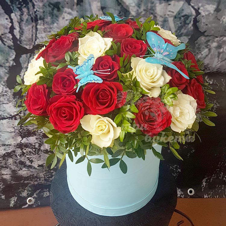 29 красных и белых роз в коробке