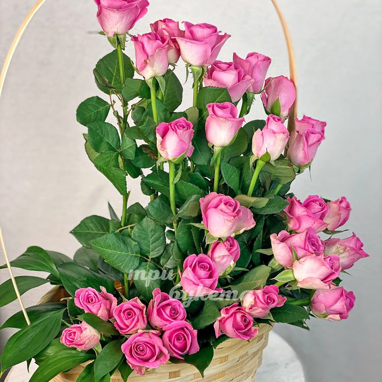 30 розовых роз в корзине