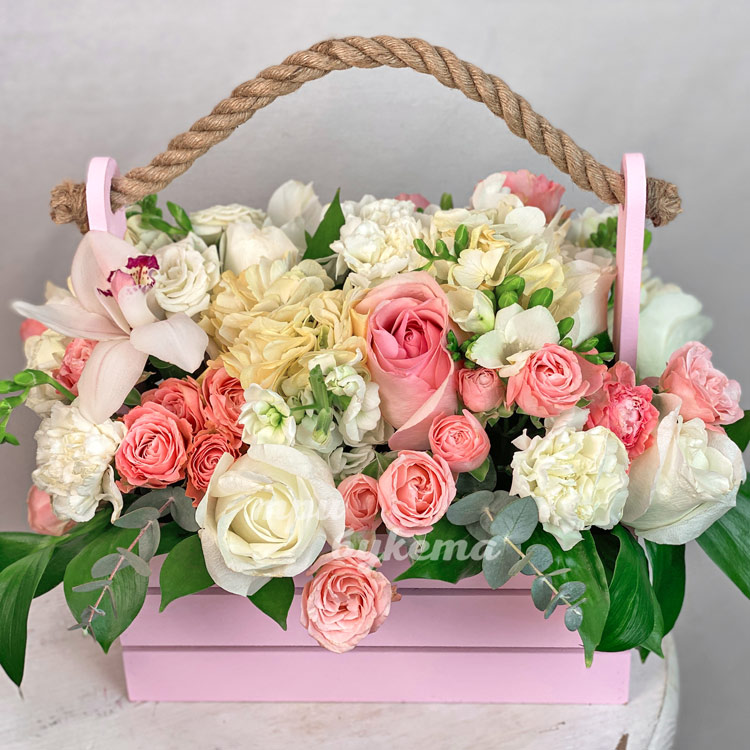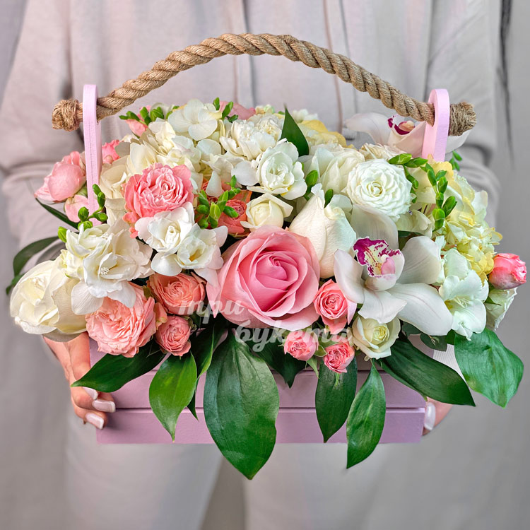 Белые фрезии и розовые розы в ящике
