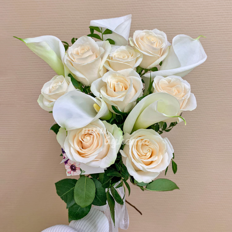 Белые каллы и персиковые розы