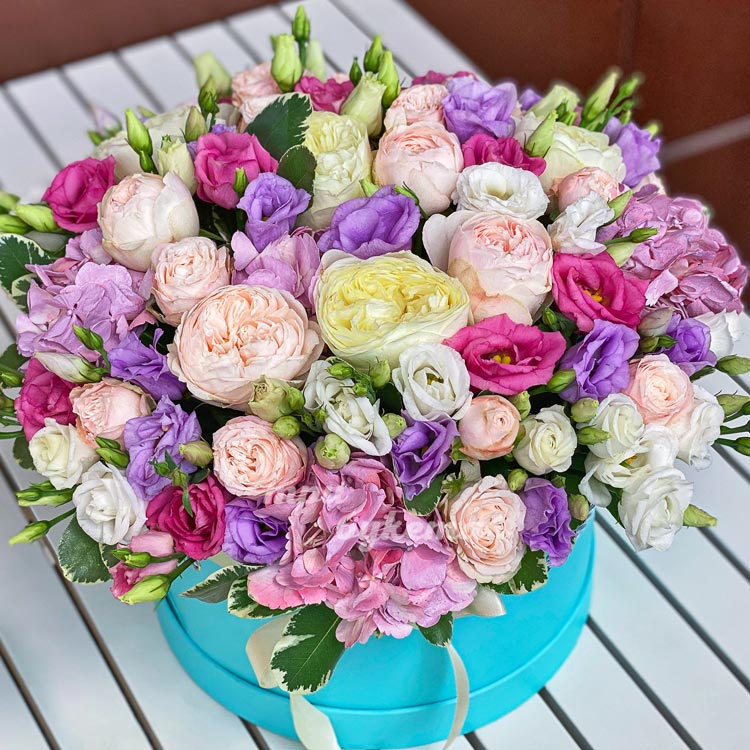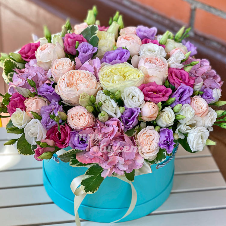 Большая коробка с разноцветными цветами