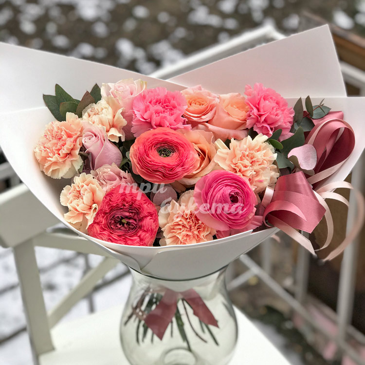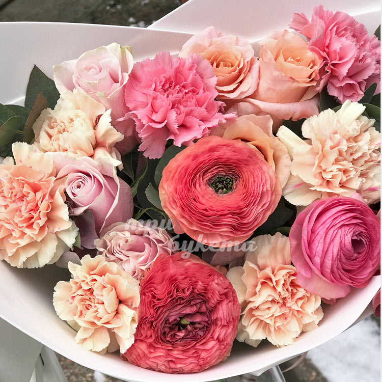 Букет ранункулюсов, роз и гвоздик